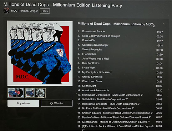 Join M.D.C. founding members Dave Dictor and X Con Ron January 23rd at 9 PM Eastern for a virtual BANDCAMP LISTENING PARTY! Well be listening to the first album , first three 7″s and the Live at CBGB’s full length! You have to RSVP. So just click this link to sign up.